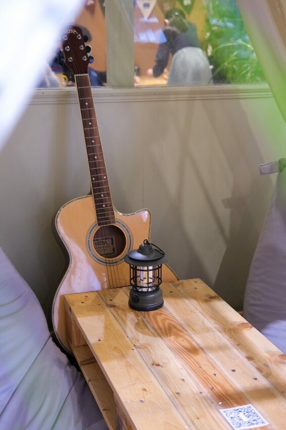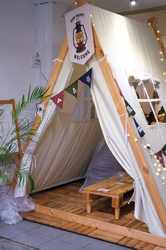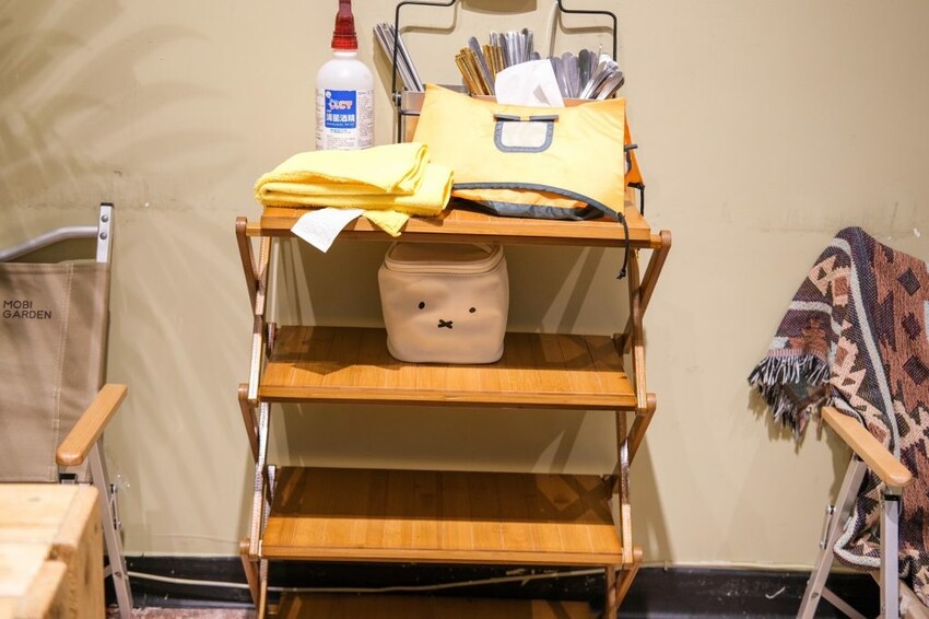 ▼【早安!一餅】延續門口的超CHILL露營風,店內擺放了許多露營相關用品,用餐區的座位也是木桌和折疊椅,讓人仿佛就像在早餐店野餐般享受~