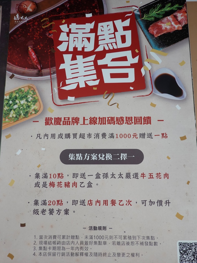 掃下圖加入『孫太太嚴選超市火鍋LINE會員』消費集點~可兌換火鍋吃到飽餐券or冷凍火鍋肉肉喔!
