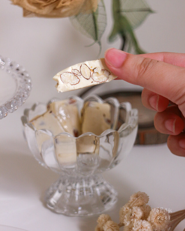 100%的百香果汁融入法式軟Q牛軋糖,再加入杏仁粒,跳脫以往牛軋糖只有甜膩的印象,加了百香果多了果香的酸甜,口感也不過硬!真的好讚!