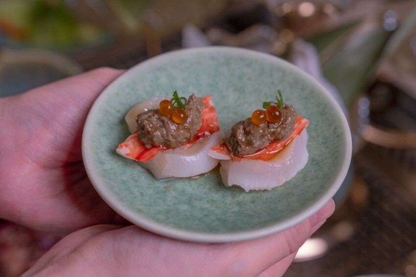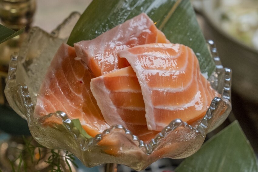 干貝、鮭魚、砲管大軟絲都是使用生食等級,鮭魚烤大概7、8分熟即可食用
