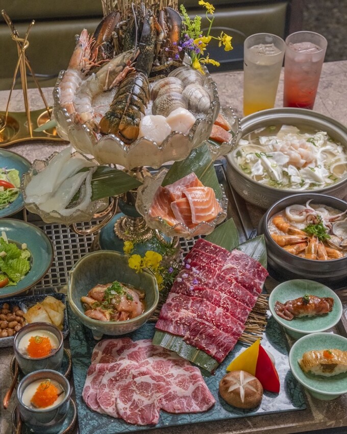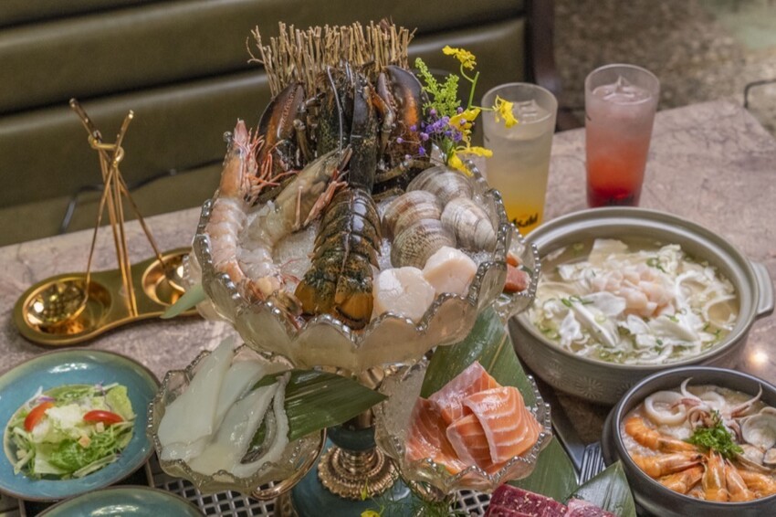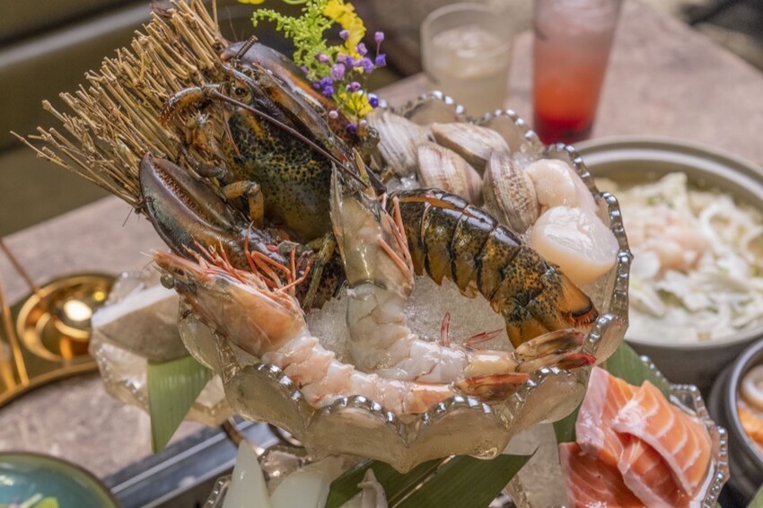 有波士頓龍蝦、牛奶貝、日本北海道干貝、挪威鮭魚、野生大軟絲、大花蝦、烏魚子,深海厚切鰈魚