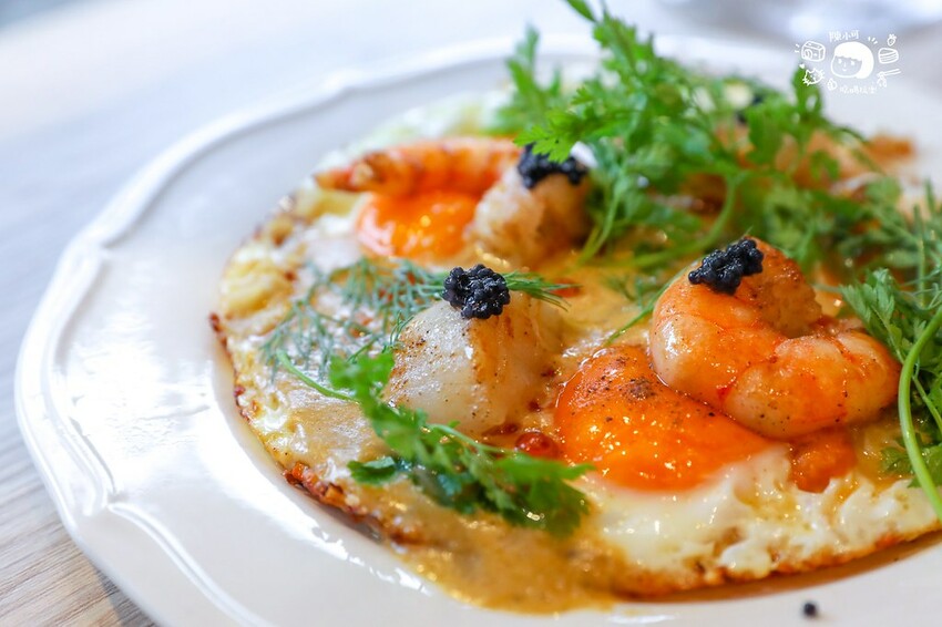 三顆半熟有機荷包蛋加上日本生食級干貝跟鮭魚卵,讓煎蛋瞬間精緻高級,肉質Q彈的鮮蝦加上松露醬濃郁的味道,喜歡海鮮的我,超滿足啊!