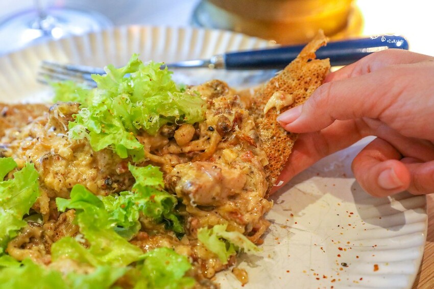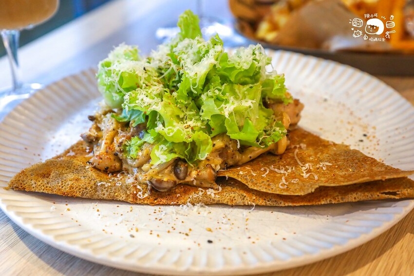 好吃的法式薄餅,外圍帶點脆度的口感,中間嚐起來則偏Q軟,薄餅上面放著被蕈菇奶油醬包覆的舒肥雞肉還有生菜。