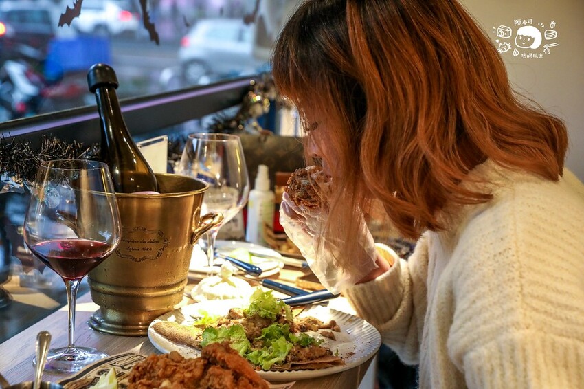 香氣迷人的菌菇混著味道濃郁的奶油白醬,加上雞肉及生菜,用法式煎餅捲起來,一口吃到嘴裡,豐富的層次,這時搭一口自然酒,又更滿足了~