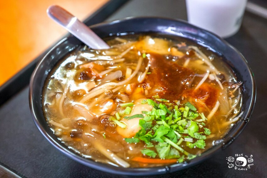 勾芡羹湯加上通心麵,有別於傳統羹湯常加的料,開口笑用的是通心麵,加上魚板、紅蘿蔔、白蘿蔔、木耳、洋蔥和少許肉燥,讓吃的人有更豐富的口感。