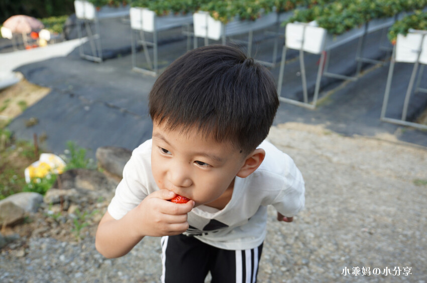 看著乖弟也非常認真的請爸爸跟他一起採草莓,剛好這個高架的高度他很可以~~~超可愛的!!!