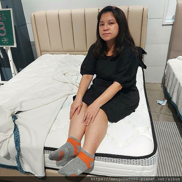 店員另外介紹兩款適合長輩的床墊,第一組是愛妮,偏硬式的獨立筒,他的邊緣很堅固,有用精緻的邊線肚邊,老孩子坐在床邊很安全,不會有滑掉的風險,躺起來蠻蓬鬆的,媽媽喜歡這一張。