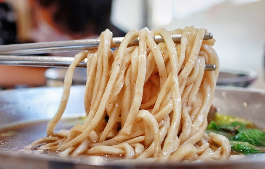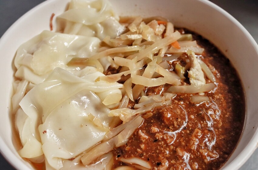 而這天我們僅點了一碗牛筋麵、一碗餛飩乾麵以及一些小菜滷味。若要添加醬料一旁架上都有可以盛裝,老胡麵館-牛筋麵的麵體算是拉麵,湯頭也算順口,牛筋燉煮的恰到適中;餛飩乾麵的餛飩就略顯遜色,乾麵還不錯,加辣來吃就更加分。