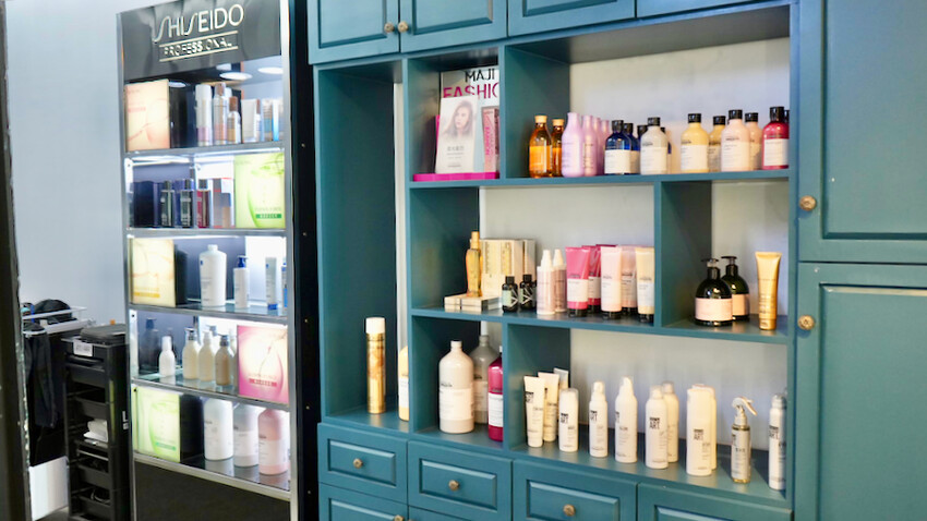 ▻ 一整面產品牆,店內使用原裝產品,不用擔心來路不明的藥水、染髮劑唷~這邊都能清楚看到產品品牌。