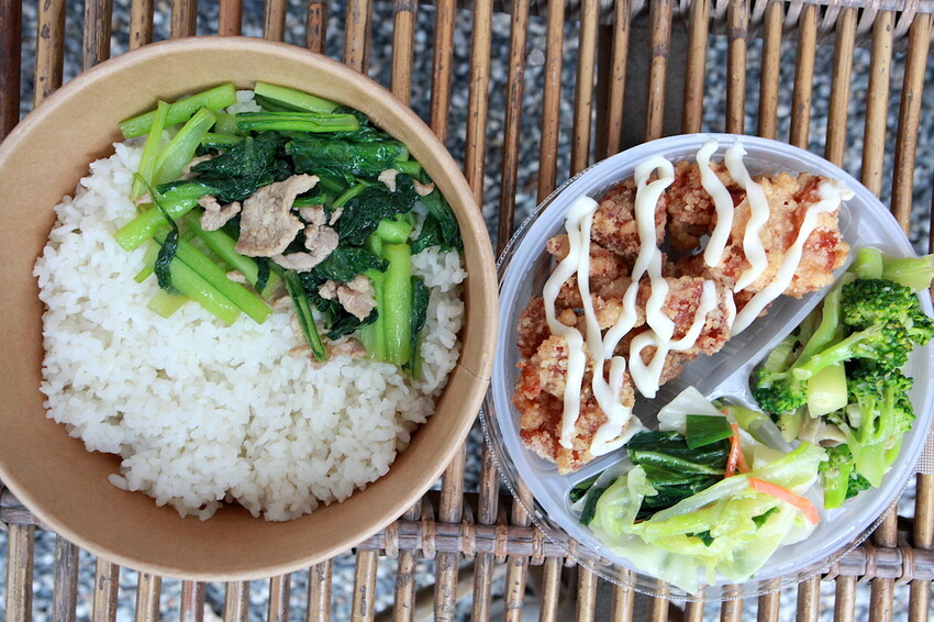 這便當採用圓形雙層餐盒來裝盛,上面有唐揚炸雞主菜跟兩樣配菜。