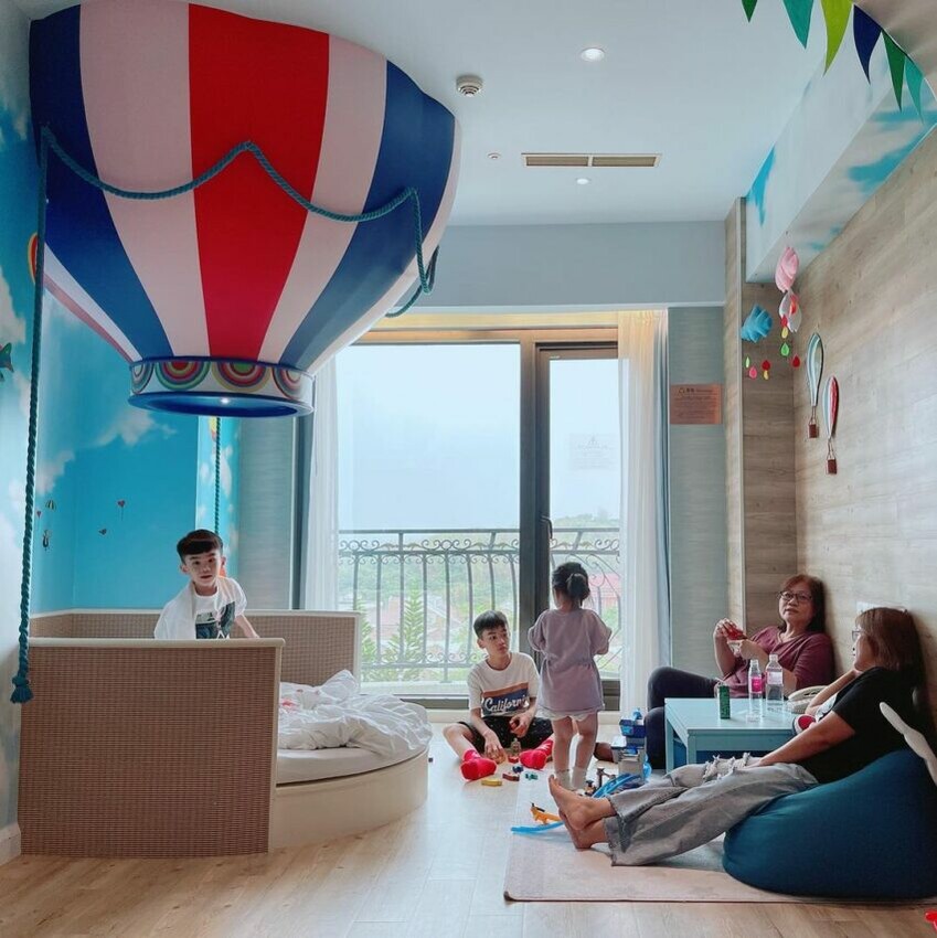 華園親子飯店除了一般房型,另有機場、捷運、賽車、港灣四種親子房型,每房約10坪~18坪,空間超寬敞。飯店提供遊戲室和休閒室等公共空間,備有小型摩天輪、球池、溜滑梯等器材,就算只待在飯店也不怕孩子沒地方跑。