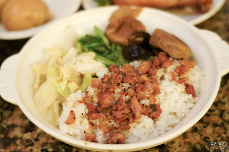排骨飯的另一主角,三樣配菜搭上滷肉飯,這樣的菜飯也滿好吃的