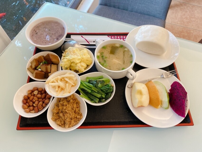 稀飯、饅頭和精緻的六道小菜~肉鬆、筍干、花生、豆干、炒蛋和時蔬,加上新鮮水果盤,一個人一份真的吃不完吶~