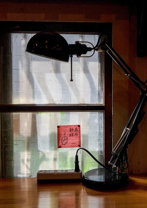 特別喜歡靠巷口這邊的磚牆、木窗、書桌,若隱若現、卻入還出的陽光,像是頑皮的小孩輕敲著花玻璃,配著「歲月靜好」的門聯,誰說日子不是如此最好。