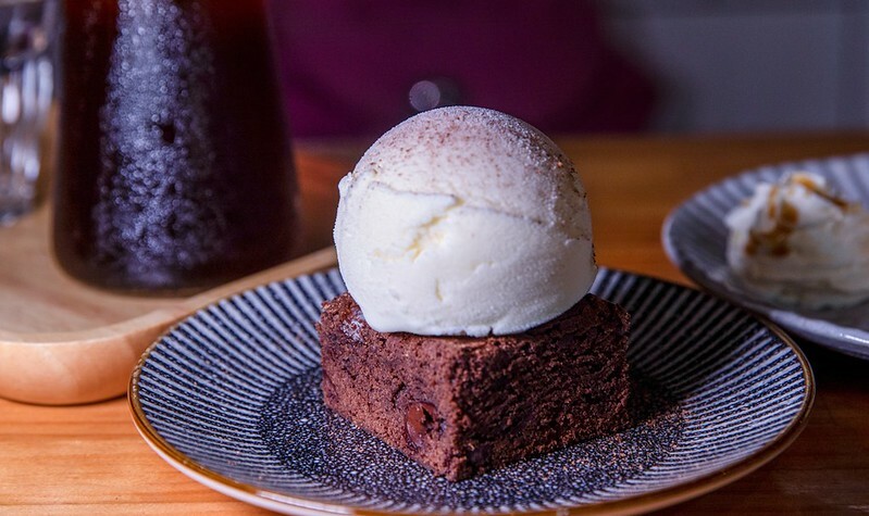 倒是布朗尼吃起來有一點乾,但也幸好有上面的冰淇淋之助,巧克力本身略帶微苦,甜度適宜,但配上冰淇淋又有一點點微甜。