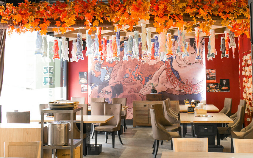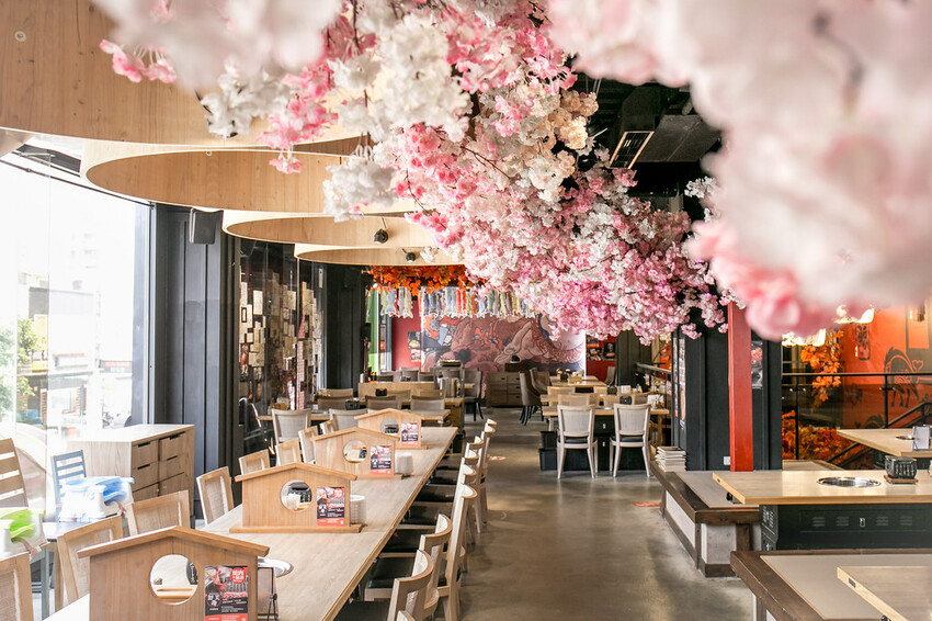 店內席次算蠻多的,有分成一般席及榻榻米座位區 (無包廂),空間寬敞坐起來蠻舒適的,此次前往剛好為『櫻花季』造景,座位區被櫻花點綴繽紛,再搭配餐廳正中間的大型日式燈籠,真的會有以為自己在日本的錯覺。