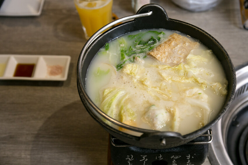 只要有點餐點即會附贈小火鍋,就樣是屋馬會提供雞白湯一樣,山鯨則為小火鍋,不過不一樣的是小火鍋富有許多的內容物,高麗菜、肉片、蔬菜、豆皮等等,燒肉吃膩的時候,來杯暖胃的小火鍋換換口味,更為舒適,個人覺得湯底比較淡一點,不過火鍋內有大量蔬菜這件事,對我是非常加分的