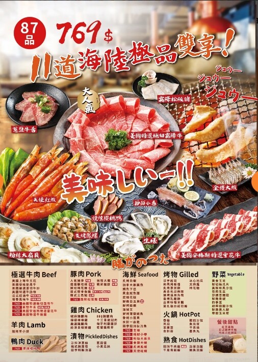 新竹和牛燒烤吃到飽推薦田季發爺燒肉!田季發爺燒肉目前菜單分為$599、$769、$939三種價位,$939菜單有高級海陸食材跟和牛可以選,還有火鍋耶!