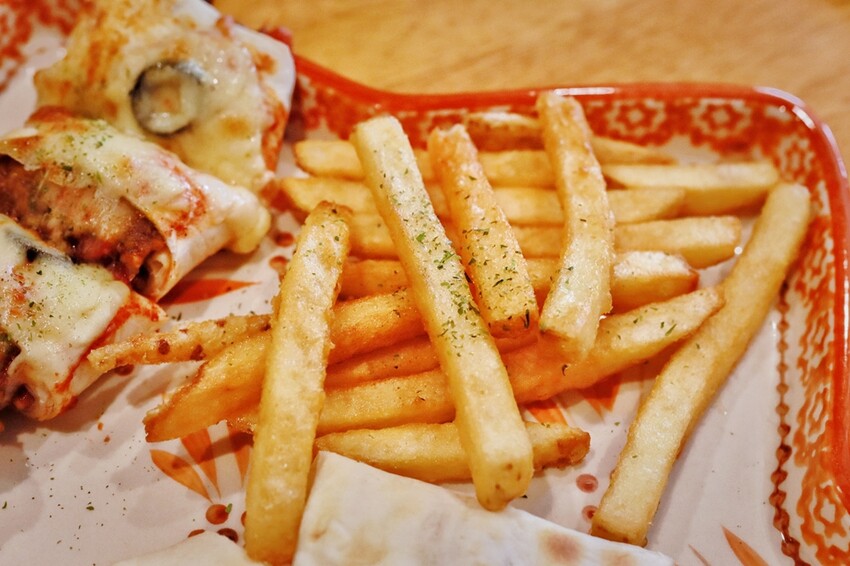 安吉拉捲有牛、雞、豬可以點選,而我們選擇牛肉口味;凱薩薄餅則有牛、雞、豬以及瑪格莉特可以選擇,我們本來想點選瑪格莉特,但店家說內餡就只會有蔬果,所以我就改點雞肉口味;薯條則是小份的!Ann和榜哥還蠻喜歡食坪異國美食的安吉拉捲。