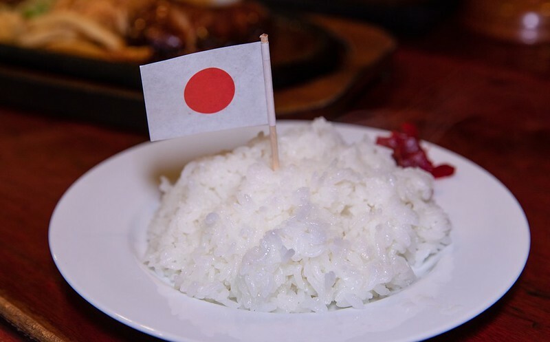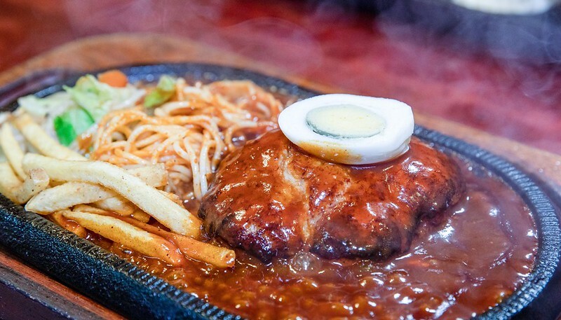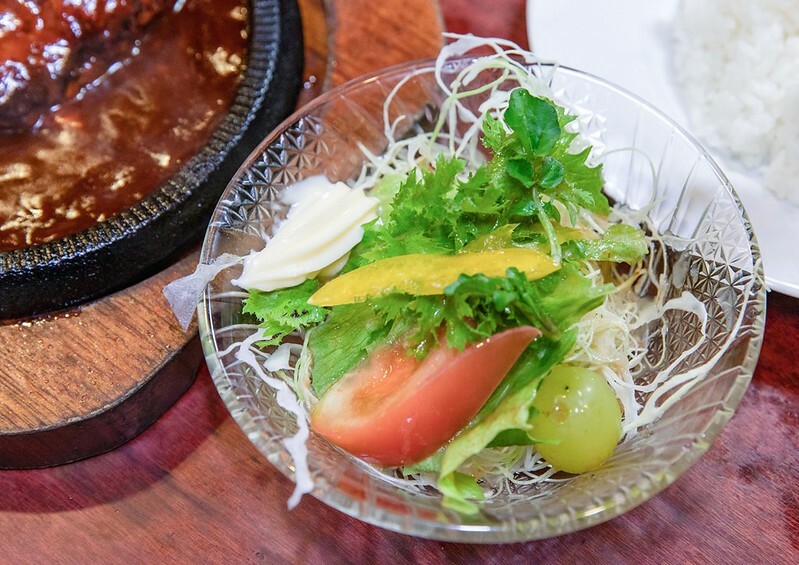 除了鐵板漢堡排外還有沙拉、白飯和冰咖啡,白飯上還插著日本國旗,超有古早風。