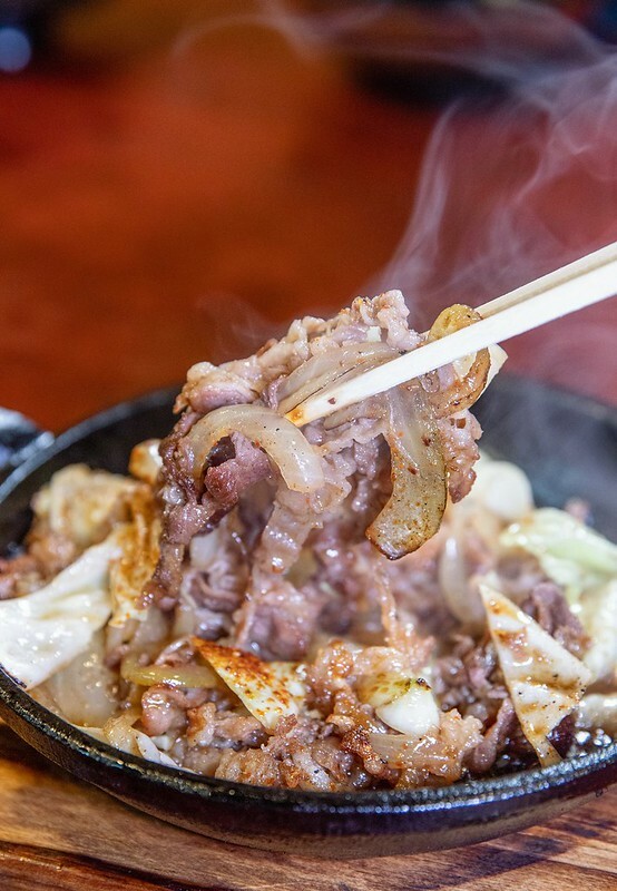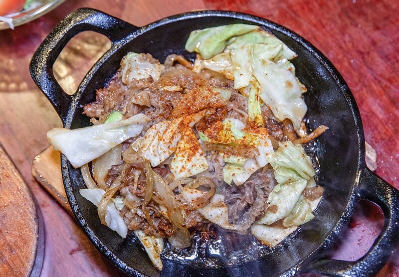 點了一份白板上寫的和牛炒大蒜,味道鹹香濃厚,帶著比想像中輕卻很討喜的蒜味,還有一點點沒辣度的辣椒粉,整體來說和牛很甜很油很香也很好吃,雖然有一點略鹹,底下鐵鍋燒出的微焦香和洋蔥混在一起深得我味,高麗菜感覺是拌上去的,仍保有一定的爽脆。好想來一杯啤酒。
