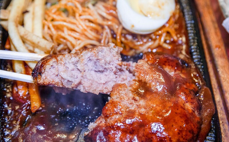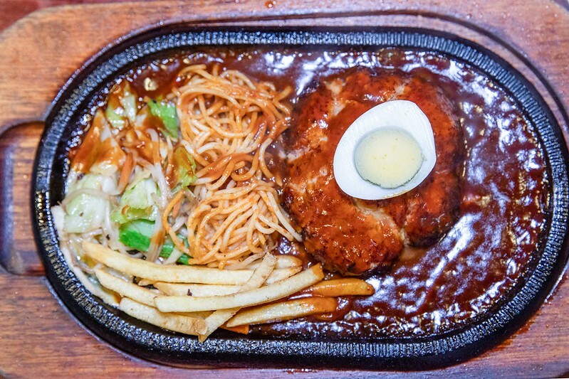 鐵板漢堡排,上來醬汁還冒著泡泡,除了不小的漢堡外,還有昭和洋風的拿波里義大利麵和炸薯條,和一點中式的炒高麗菜,果然是日、洋、中三日月xd