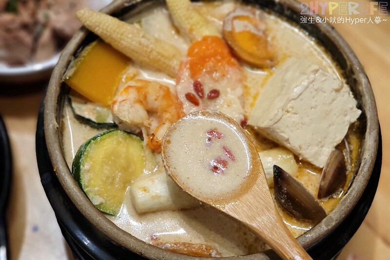 這個生蠔等級,應該會讓許多男生饕客蠢蠢欲動吼,哈哈!至少5~6塊超大廣島蠔,還有底下的櫛瓜、南瓜、玉米筍,布袋虱目魚丸、豆腐等,而且鍋物類都有附二碗白飯是可以2個人一起吃的,真的非常超值