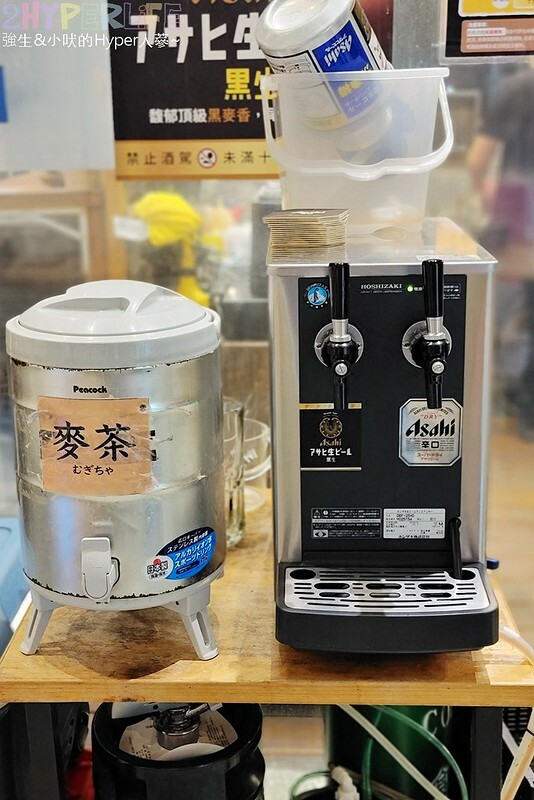 店內有提供免費麥茶,右邊是Asahi生啤機。