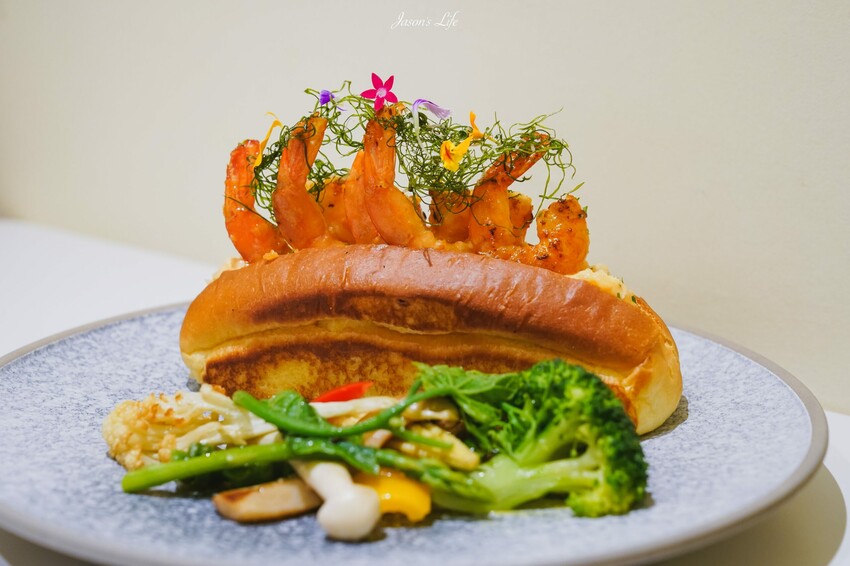 加上去殼白蝦使用蒜味奶油拌炒過後,一隻隻可愛的插在堡上