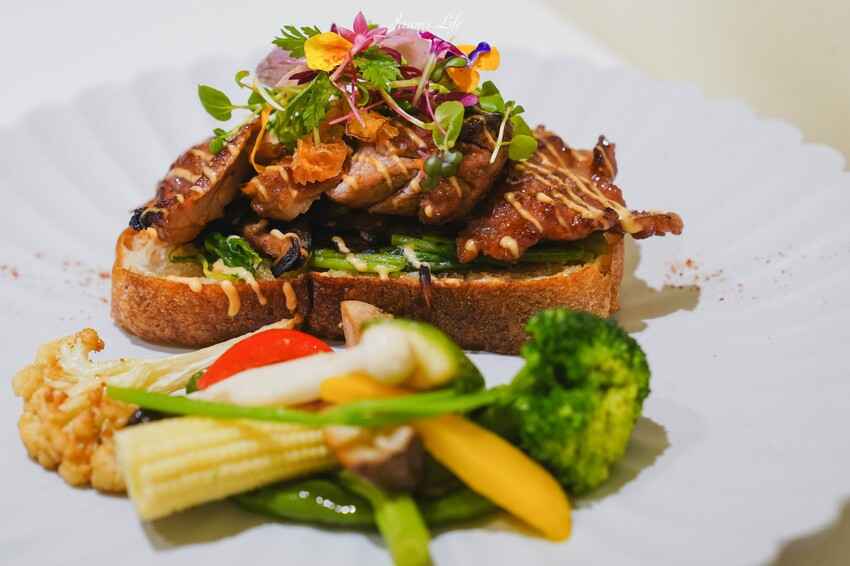 歐式麵包上堆疊了使用西班牙豬蓋肉,再用秘制燒肉汁拌炒