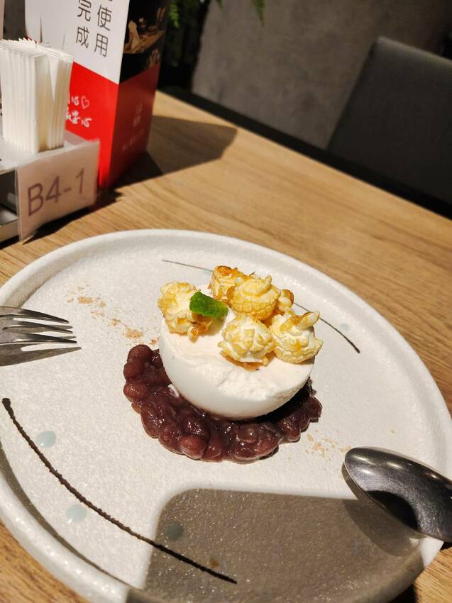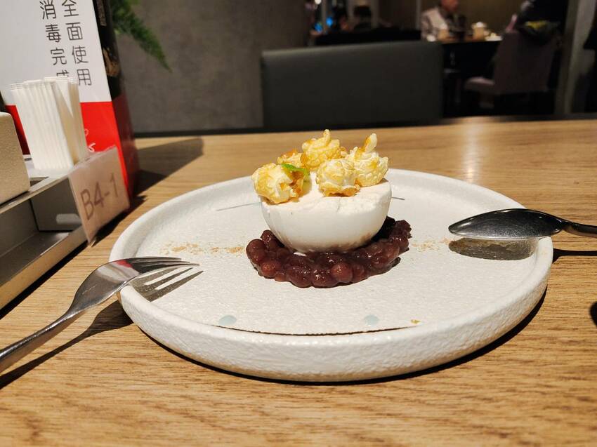 第九道/甜點:爆米花紅玉豆腐冰淇淋爆米花+紅豆泥+冰淇淋,造型好看,味道就一般般。