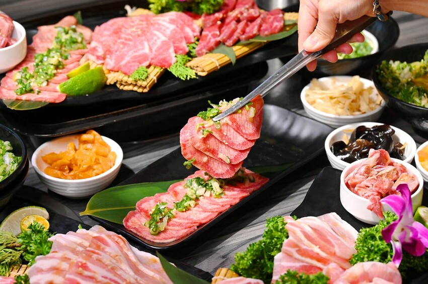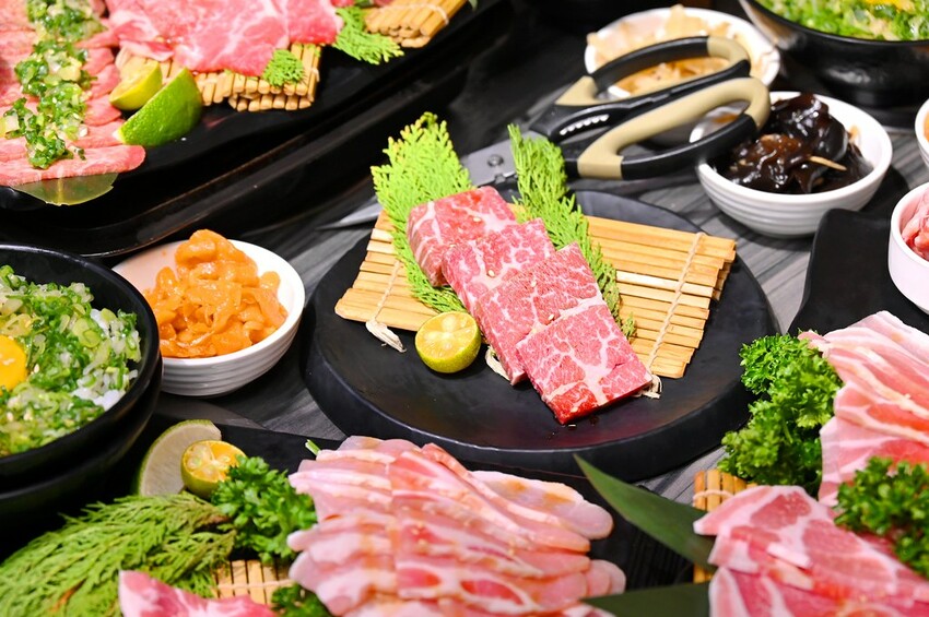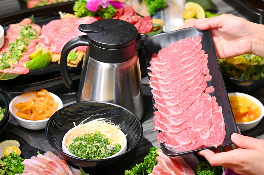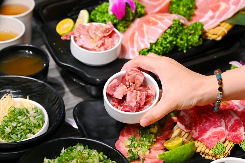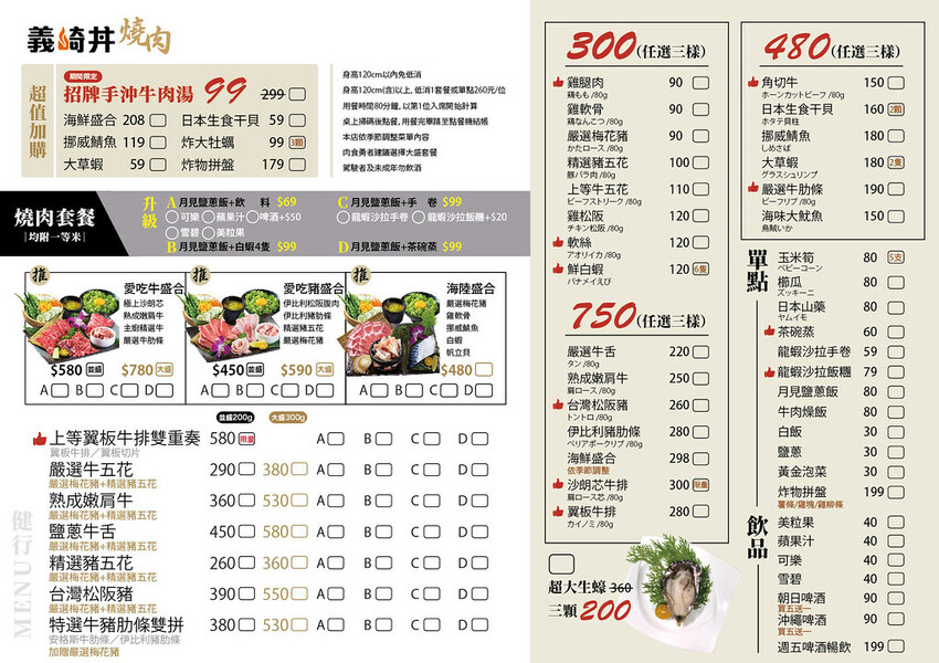 這邊主要以「燒肉套餐」為主,份量以單人燒肉基本(並盛)200g肉量為主,有七種肉品,另外還有設計三種更豐盛的盛合套餐,有含更多樣(四種)肉品組合,能吃得更有變化性更加有滿足感。單點區也有提供300元、480元及750元三種區間任點組合,任選三樣食材更加划算飽足。