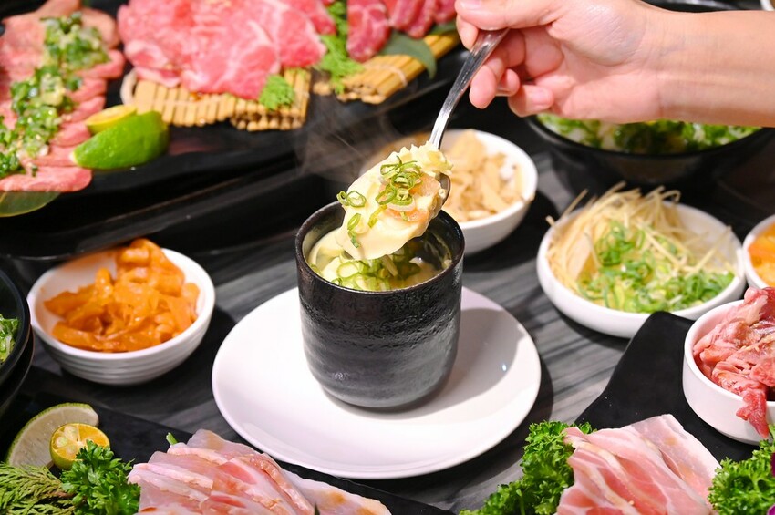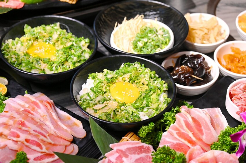 另外燒肉套餐都會附一碗白飯,我們是選加價升級D套餐「月見鹽蔥飯+茶碗蒸/+99元」,這碗月見鹽蔥飯還真的很好吃,滿滿夠味鹽蔥,加上稠濃蛋黃香氣,吃完好想再來一碗。另一碗升級C套餐月見鹽蔥飯是+龍蝦手卷,