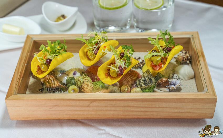 帶有海洋氣息的珠寶盒般的餐點上桌,很華麗繽紛的視覺感