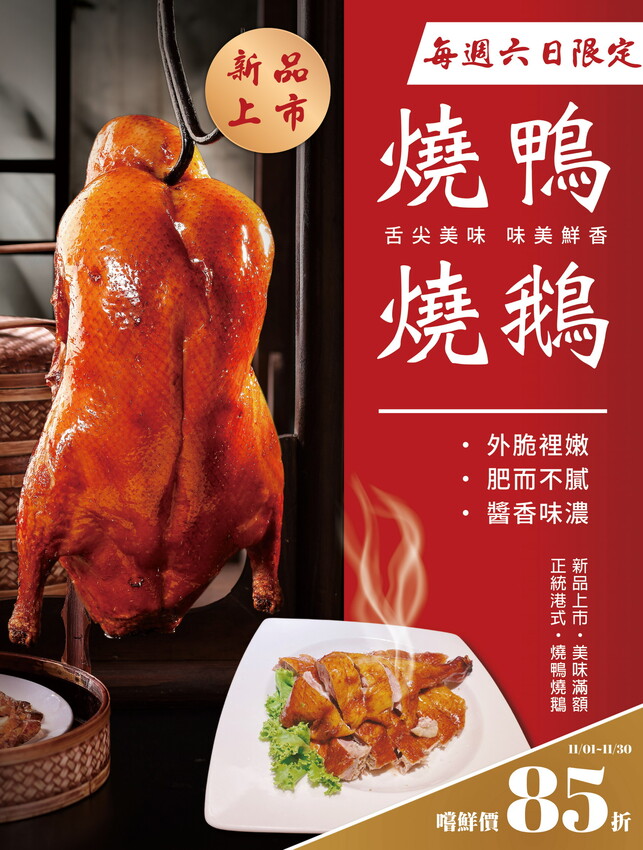 趁著11/1-11/30周年慶,不只有85折優惠,還有新品燒鴨燒鵝上市,大家快趁這個機會來品嚐美食吧!