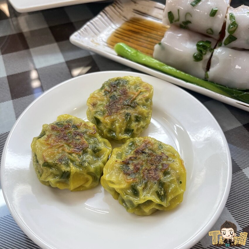 金錢韭菜餅 (118元/3入),微酥的外皮,內餡有滿滿的韭菜、蝦肉跟豬肉餡,屬於較重口味的港式點心。