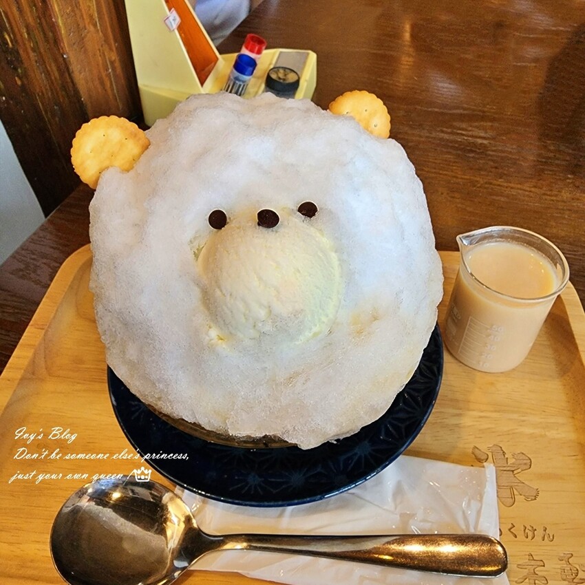 小熊刨冰底層有萬丹蜜紅豆、客家仙草、甲仙芋頭、小米桂圓米糕和珍珠,將附上的牧場煉乳分次淋在白冰上,每一口都會是好味道