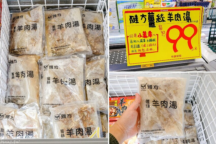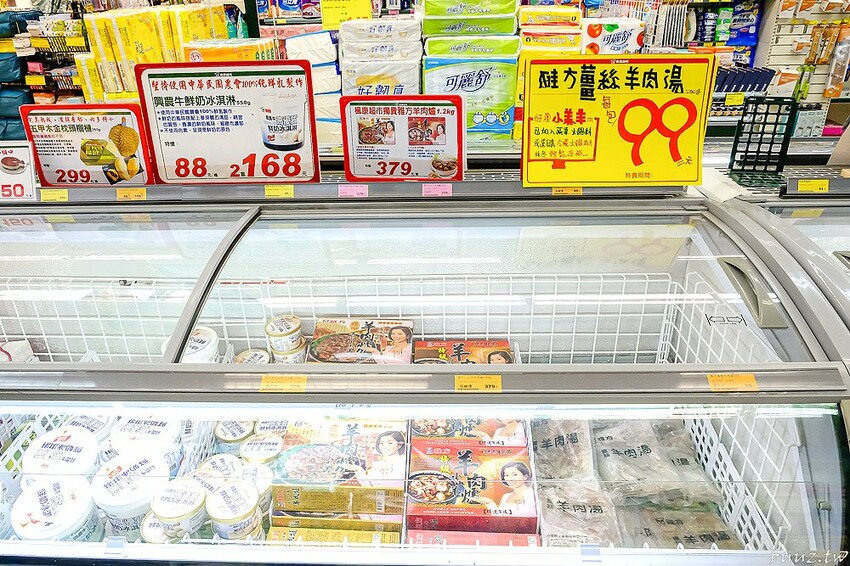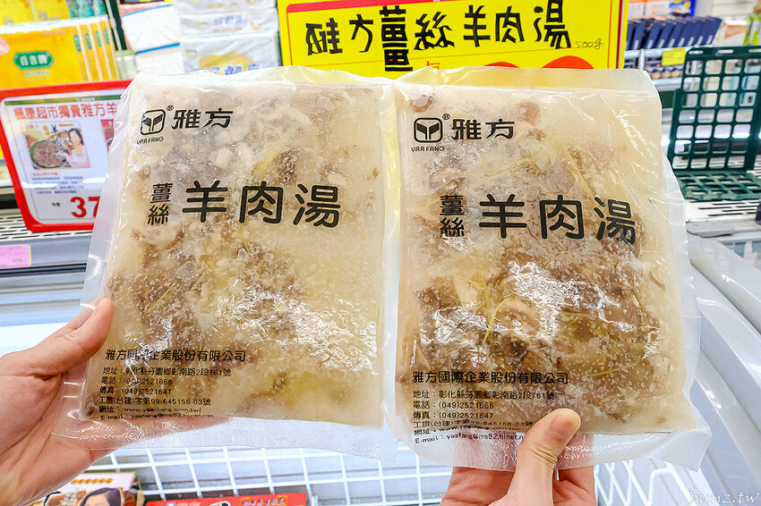 挑好肉品後我們來到放置雅方羊肉爐、雅方羊肉湯冷凍櫃區域,可以看到裡面有一包包「雅方薑絲羊肉湯」~