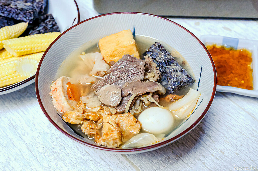將一整鍋食材煮熟煮透後,整個羊肉湯加上食材頗有類似吃關東煮的風味,而且有放高麗菜一起煮過湯頭還是很清澈清甜。