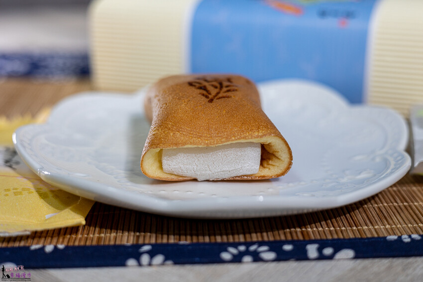 牛皮燒菓子,看了官網的介紹說這款菓子的顏色跟黃牛本身的皮顏色相近,所以稱為牛皮,還挺有意思的,以糖、雞蛋和麵粉製成的和菓子麵皮,上面烙印著一朵花紋在包裹著純米做成的麻糬,麵皮微甜且不會太厚重。
