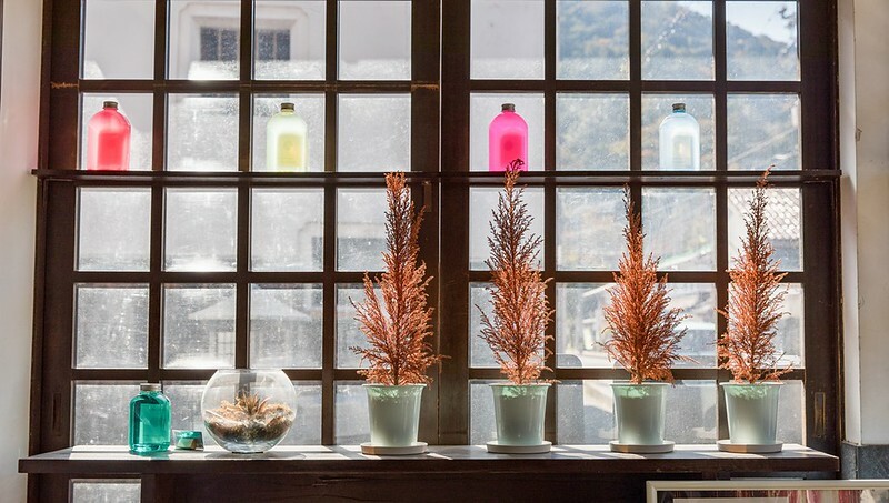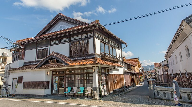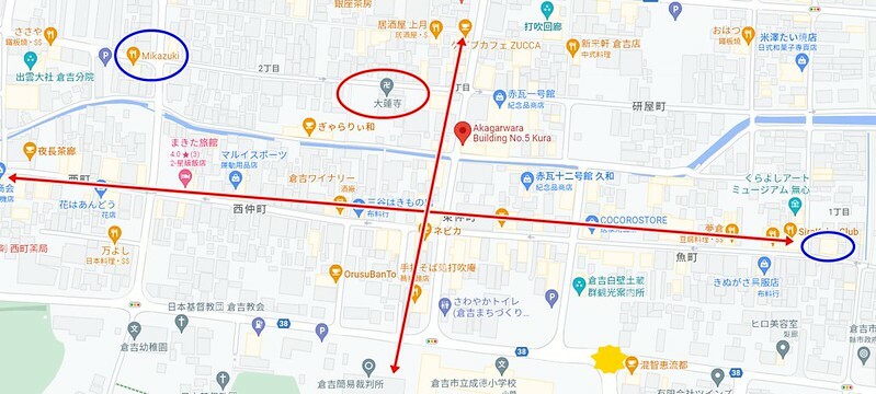 這些赤瓦白壁的百年建築多半依著貫穿倉吉老街的玉川,這裡也曾是室町時代伯耆国打吹城的城下町,有關打吹城的歷史咱們留待介紹倉吉老街時再詳談。今天要帶大家去的赤瓦五號管,位於玉川河岸旁,離倉吉名寺大蓮寺頗近,兩旁的藍圈是早前分享過的兩間倉吉老字號餐廳「レストラン三日月」和「町屋清水庵」,也是我們當天倉吉一日遊的午、晚餐。