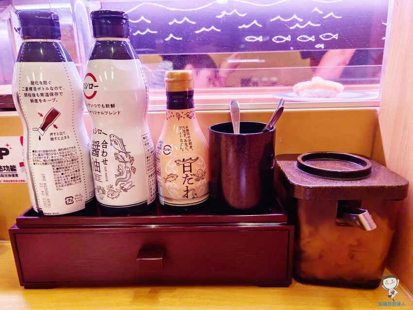筷盒上面擺了幾瓶調味料,最右邊的則是可自行添加的嫩薑