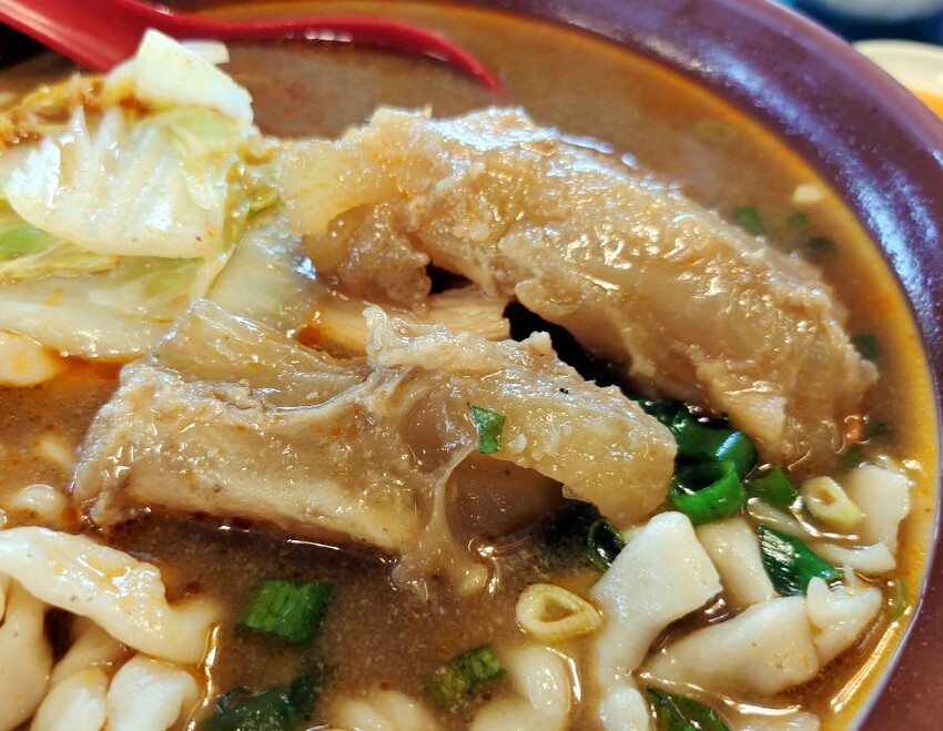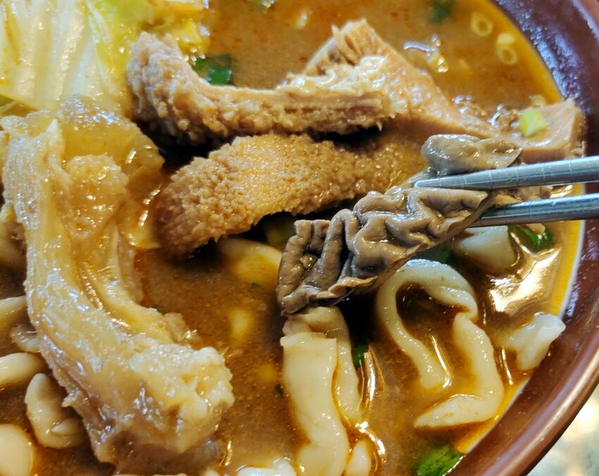 ▼半筋半雜麵,也就是牛筋加上牛雜的配料,搭配的是粗捲麵,我們點的是小辣!