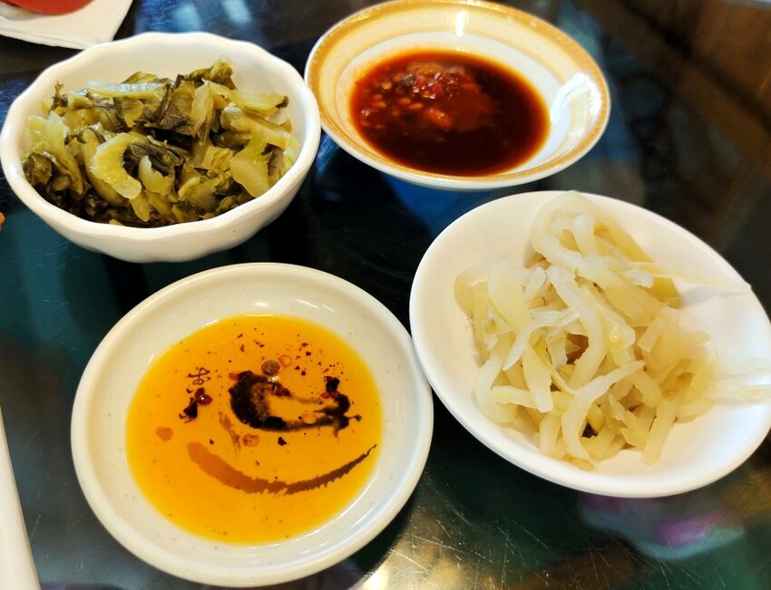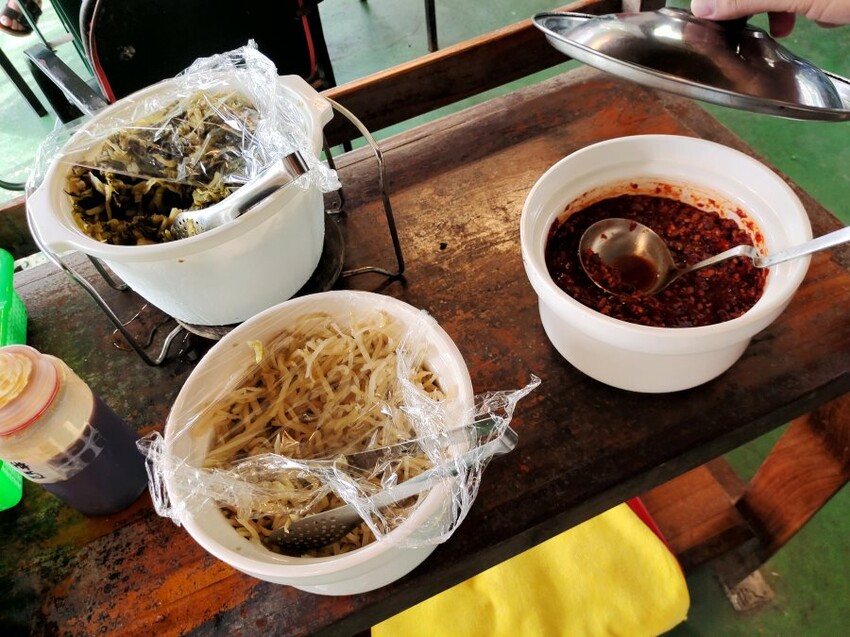 ▼我們還拿了酸菜、榨菜、辣油、豆瓣醬+醬油膏搭配享用,不過他的配菜都沒有明顯的味道,口味偏淡,辣油也只有油香而沒什麼辣度~基本上都可以省略(笑)!