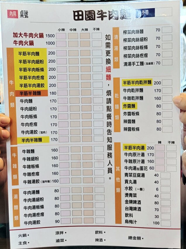 ▼菜單,有牛肉火鍋、牛肉、牛雜、湯麵、清湯、乾麵、其他餐點等,選擇還不少,還可以自行選擇辣度~~此外也可以更換細麵,點餐時告知即可!