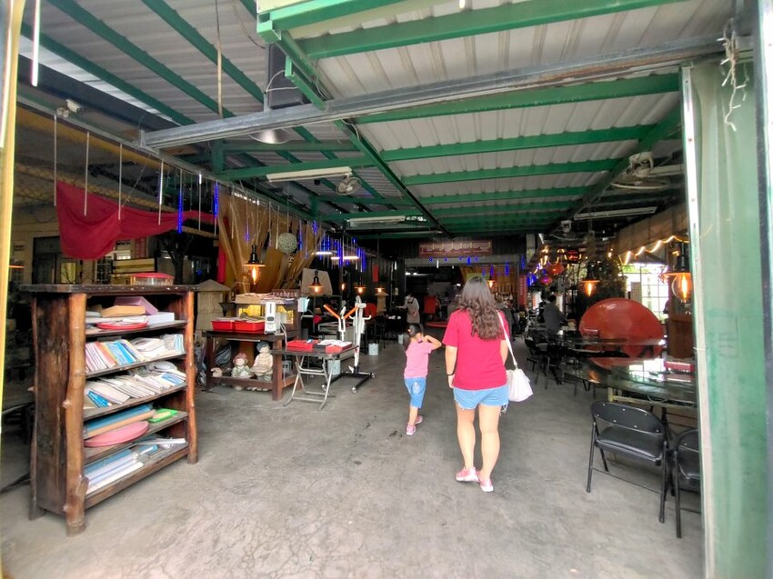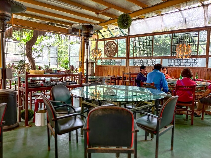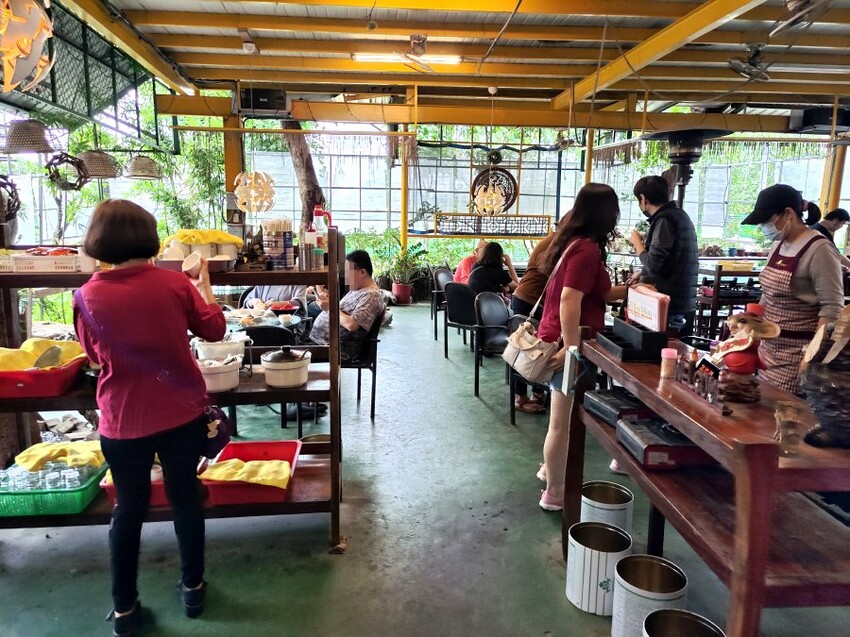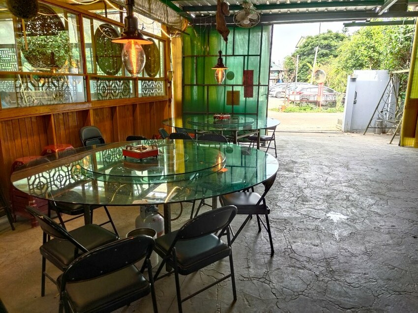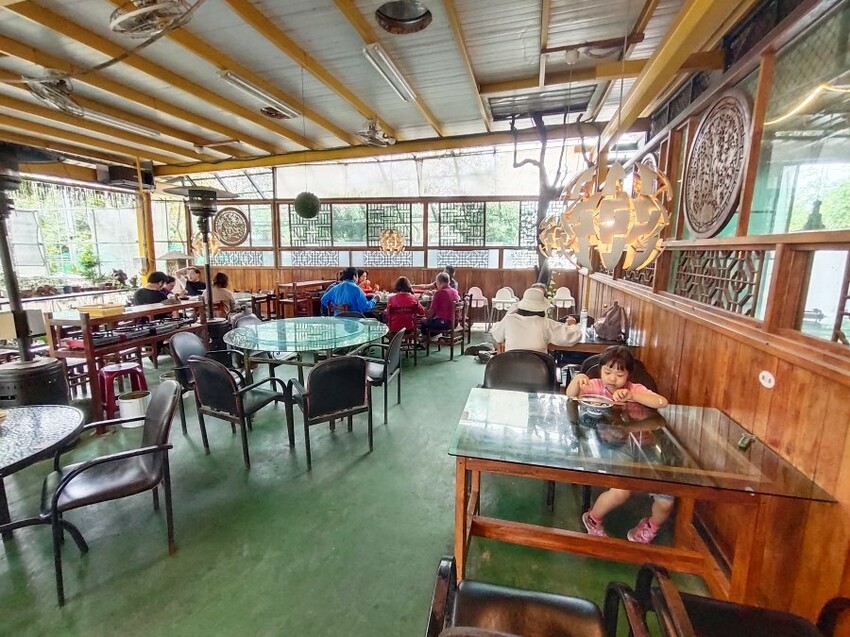 ▼我們是坐在右側的用餐區,這裡大多以方桌、小圓桌為主,加上滿滿綠意,跟入口處比起來有種世外桃源的感覺~不過也因為是半開放式空間,沒有冷氣只有電扇,難免會有一些蚊蟲,擔心的朋友記得帶防蚊液!