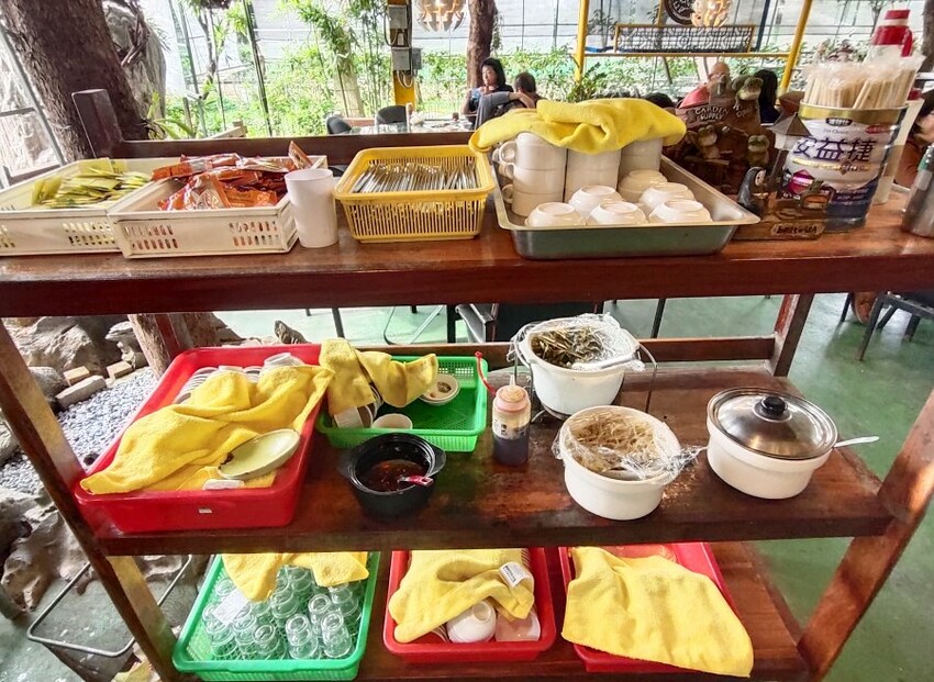 ▼用餐區的左側有一個自助區~不管是餐具、醬料、配菜、茶包等都是在這裡自行取用!