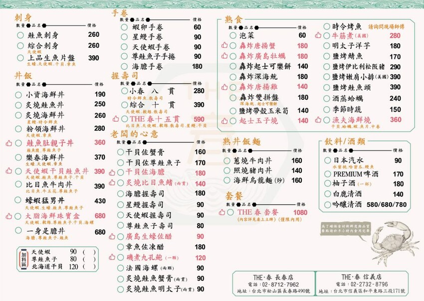 【THE.春】以新鮮的日式料理為主打,供應刺身生魚片、海鮮丼飯、手捲、握壽司、炸物、烤物、煮物、熟食丼飯、烏龍麵等品項,其中海鮮生食系列更是人氣品項,來用餐的話絕對不能夠錯過~