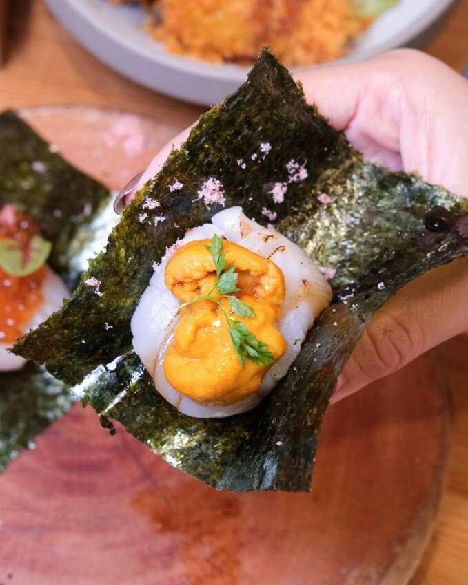 ▼豪華指數破表的干貝握壽司系列,搭配海膽或尊鮭魚卵都各有風味,海苔的鹹香交織干貝的鮮甜,加上尊鮭魚卵逼逼波波的口感,相當過癮,而我喜歡干貝+海膽的組合,海膽吃起來濃醇鮮美,讓干貝的鮮甜滋味更加明顯~