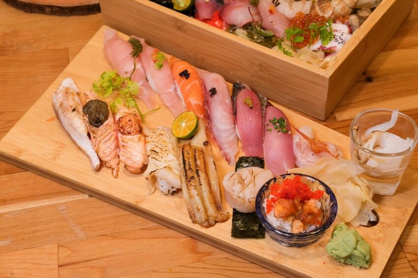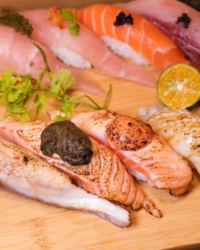 ▼擺盤賣相豪不遜色的THE.春十五貫,吃得到鮭魚、鰹魚、旗魚、鯧魚、天使蝦、軟絲、星鰻、干貝、比目魚豐富食材,再搭配炙燒、松露、柚子胡椒等不同的調味方式,每一口都能品嚐到多變的風味。